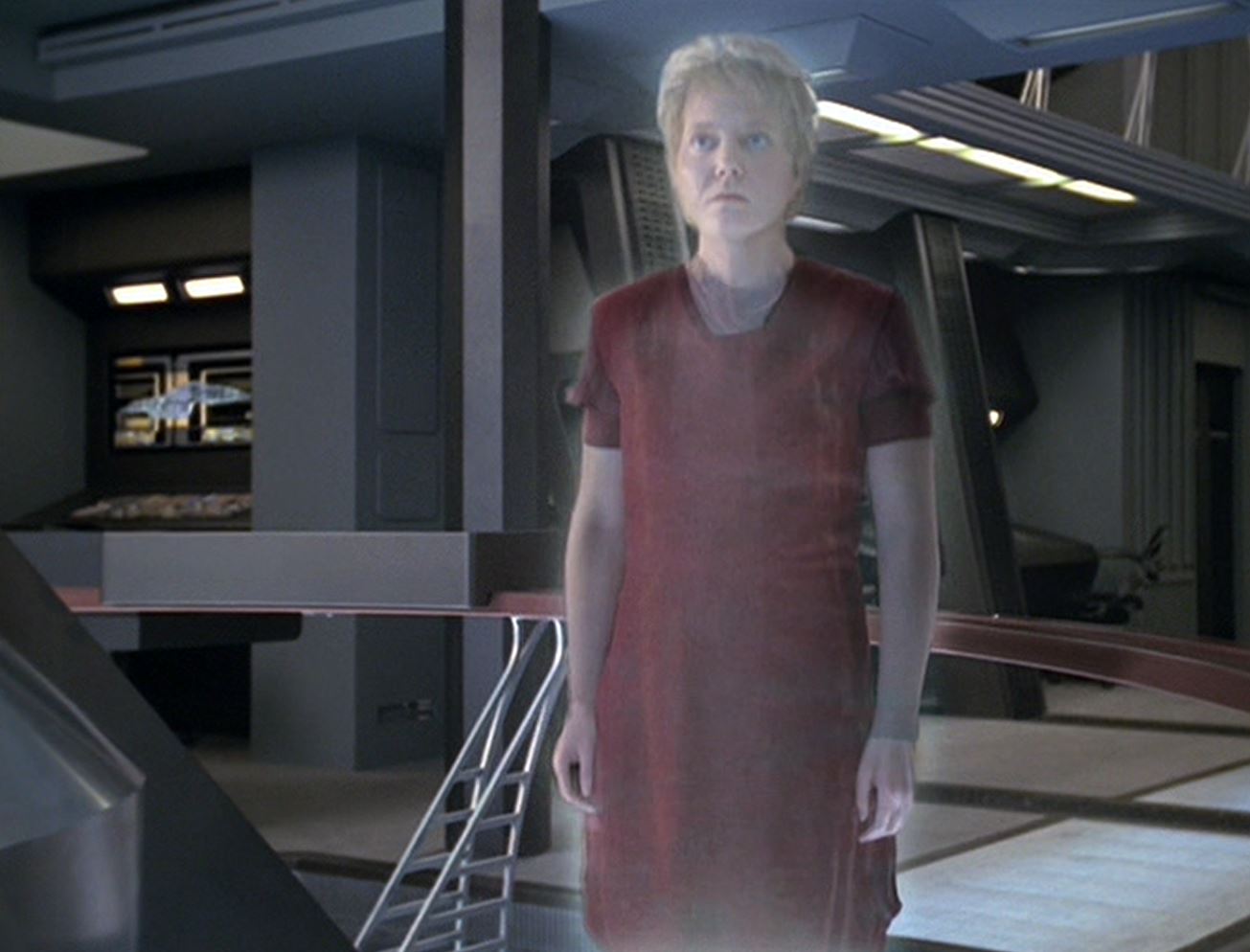 While entering a turbolift Tuvok sees Naomi Wildman. He follows the hallucination to Cargo Bay 2 where he sees the alcoves with all the rescued former Borg, Azan, Rebi, and Seven of Nine, regenerating. Then he snaps back to reality when Lieutenant Carey, working at a console, asks him if he is all right.