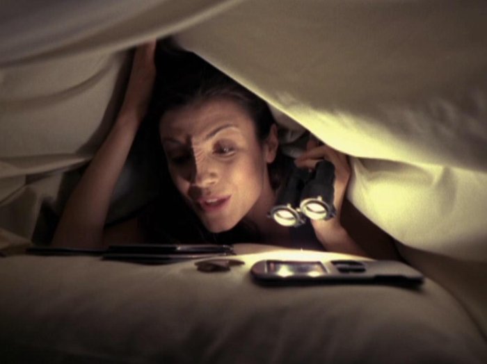 In Tal Celes' quarters, her roommate is sleeping and she's contacting her friend William "Billy" Telfer via combadge. She tries waking him up, and he finally answers. He tells her it is late and to go to sleep. She is under her covers with PADDs and an SIMs beacon, working on a level 3 sensor analysis. Telfer breaks down, and asks what the problem is. She says she's having trouble interpreting the subspace infrared from the cluster. Telfer says that it is too complicated to explain over the com, and to either meet in the mess hall or do it tomorrow. Tal replies she doesn't want to get dressed, and that she has to have it in tomorrow. "Your only options", he says sleepy-eyed.