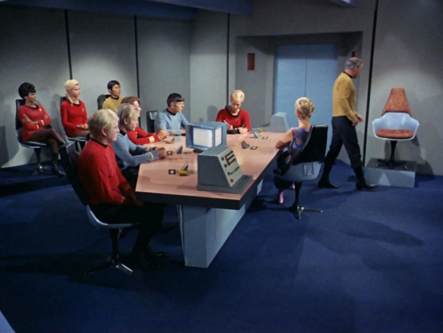"Captain's Log, Stardate 1329.2. On board the USS Enterprise, a ship's hearing has been convened against the transport vessel's captain. I'm becoming concerned about the almost hypnotic effect produced by the women." Captain Kirk held a fact-finding hearing to investigate the actions of Harcourt Fenton Mudd and the women whose passage to Ophiucus III he was overseeing. (TOS: "Mudd's Women")
