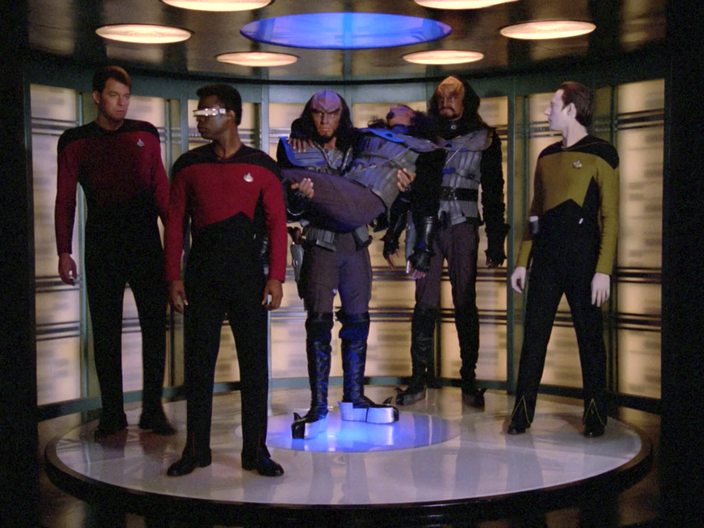 They locate the survivors on the far side of the engine core. Data goes across on his own, to minimize the risk to the others. He returns, telling them that the door to the compartment is jammed. The others run over, and Data pulls open the door. Entering the room, Riker and La Forge discover that there are three Klingons inside the compartment, one badly injured.