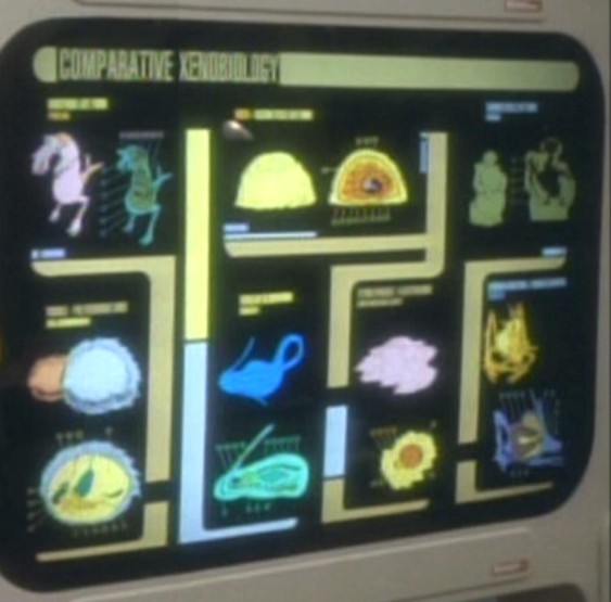 Information about the Horta was displayed by a computer, as an okudagram graphic depicting Comparative Xenobiology, in Keiko O'Brien's schoolroom on Deep Space 9. (DS9: "A Man Alone", "The Nagus" okudagram)