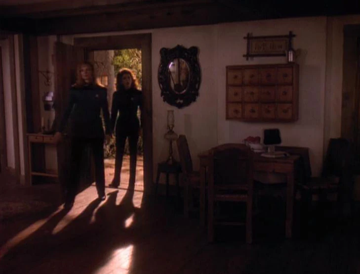 Beverly Crusher and Deanna Troi enter the Howard family home after Crusher's grandmother's funeral