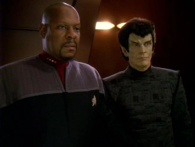 Sisko at this point is getting nervous, as Senator Vreenak comes to the station in a cloaked Romulan shuttle (with no one other than Sisko and Garak aware that he's there). Before Sisko greets Vreenak, Garak tells him he plans to inspect the Senator's ship covertly (for anything "useful"), and leaves. Upon arrival in the shuttle bay, Vreenak smugly exchanges greetings with Sisko, taking great pleasure in egotistically dressing him down for how poorly the Federation Alliance is faring in its war with the Dominion so far.