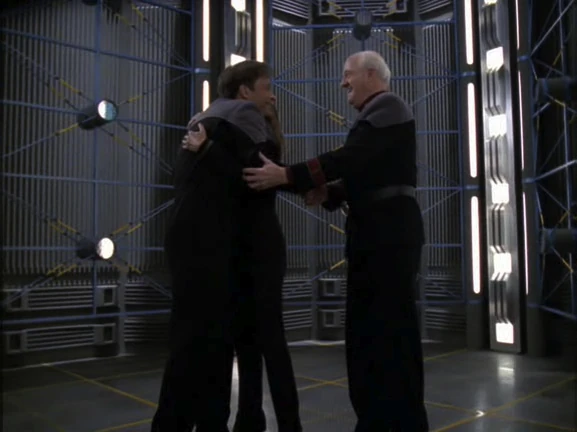 Reginald Barclay, Deanna Troi, and Owen Paris revel in the foiling of Nunk's plot to steal Seven of Nine's nanoprobes.