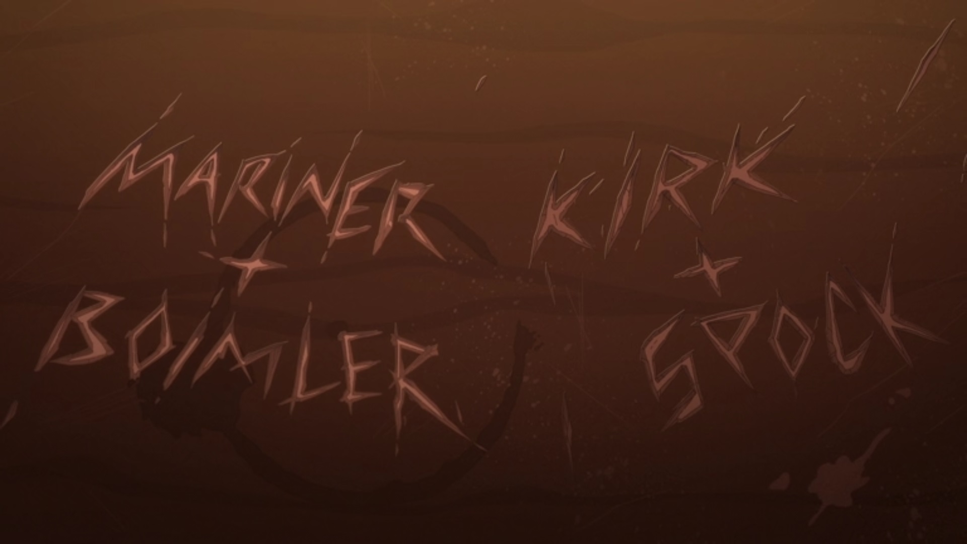 In recollecting the incident, the alien bartender, who coincidentally was the same who served Kirk and Spock years before, added to her story that "[t]he blonde one did most of the drinking." Before they left, "Kirk + Spock" was left behind, scrawled into the bar's countertop. Likewise, before Mariner and Boimler left, they too scrawled their names alongside those of their heroes. (LD: "An Embarrassment Of Dooplers")