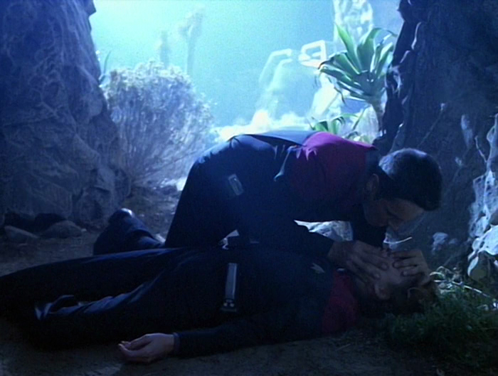 Chakotay desperately trying to revive Janeway after their shuttle crashes