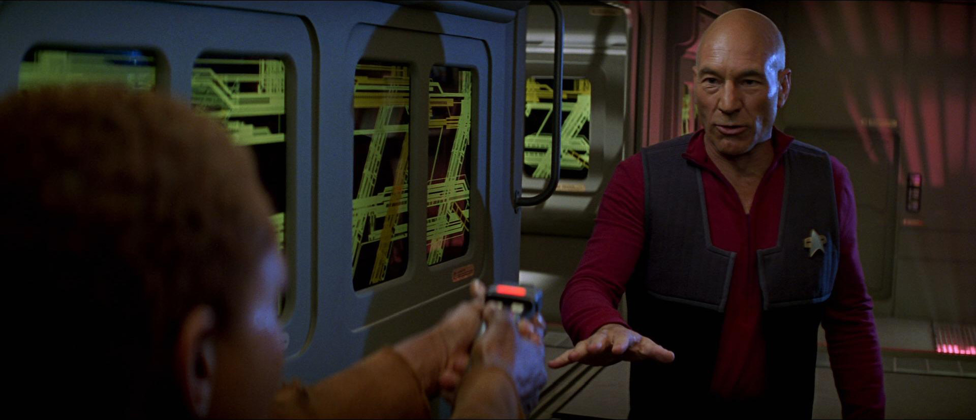Once aboard, Sloane was treated for severe radiation poisoning, but was revived by the medical staff when the Borg overran the Enterprise sickbay. Retreating to a Jefferies tube, Sloane slipped away from Doctor Crusher and her team, eventually coming across Picard. She held the Captain hostage until he was able to convince her that she was not in Montana anymore. Relinquishing the phaser to Picard, Sloane accompanied the captain in his effort to retake the ship.