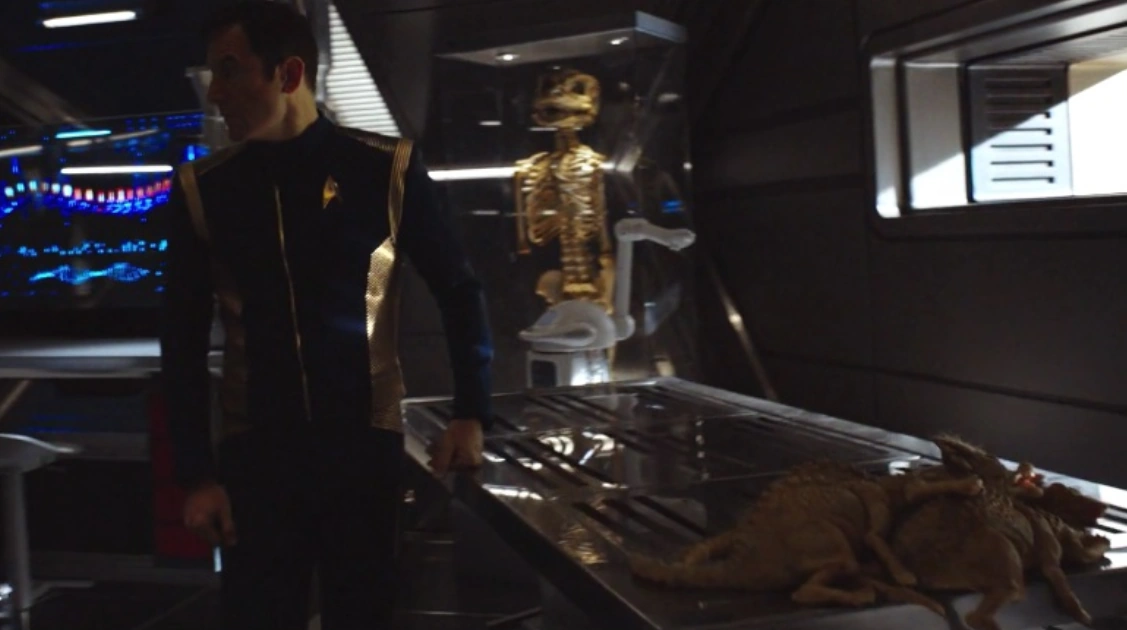 During the interview, Harberts revealed that the Gorn skeleton was a deliberate hint at Lorca's eventual character arc. Since the United Federation of Planets (as of the time of filming) weren't supposed to have made contact with the Gorn until 2267 in the Star Trek: The Original Series episode "Arena", Lorca having a Gorn skeleton was supposed to hint at the fact that he wasn't from the Federation, nor from this universe at all. Harberts also explained that because Lorca was mysterious and had a lot of secrets, they wanted a set different from the ready room, which he could prowl around in; a set that added to the mystery and animal-like nature of his character.
