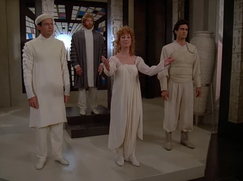 Riva eventually arrives, coming close to each one of them without speaking. Then, three others arrive, calling themselves his chorus. They explain that they are his interpreters, since he is deaf. In fact, for many generations there have been people like Riva and interpreters like them, since he comes from the ruling line on his world that all lack the gene for hearing. They call themselves the scholar, the warrior, and that which binds them. It's a beautiful method of interpretation, Troi admits. Riva is impressed and attracted by her telepathic capabilities and, foremost, by her beauty.