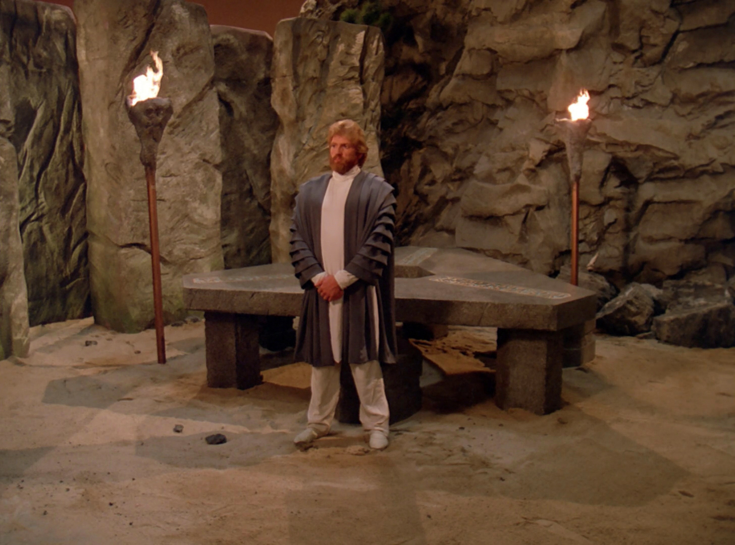 Worf, Riker, Riva and his chorus beam down to the site. Riva calls for a specific kind of table and torches from the Enterprise to set the stage, though the two factions arrive before they are beamed down. During this initial meeting, Riva tells the two factions that they have shown true courage by coming to this summit. As Riva continues to speak, a rogue member of one of the factions suddenly opens fire at the negotiation team, missing Riva due to Riker's interference but instead killing his whole chorus. The enraged leader of the faction instantly executes the rogue subordinate and quickly throws up his hands, pleading for them to stay. In the confusion, Riker orders immediate beam-out of Riva, along with himself and Worf.