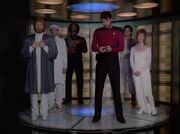 At first, Picard angers Riva by speaking to the scholar member of his chorus, angrily telling the captain that he should speak only to him. Picard apologizes, insisting he meant no insult in the inadvertent breach of protocol, which Riva accepts, telling Picard that no insult is now perceived. Riva, through his chorus, tells Troi she has a fine mind and Picard politely tells the mediator that the situation on Solais V is worsening. He agrees to be beamed up to the Enterprise along with his chorus.