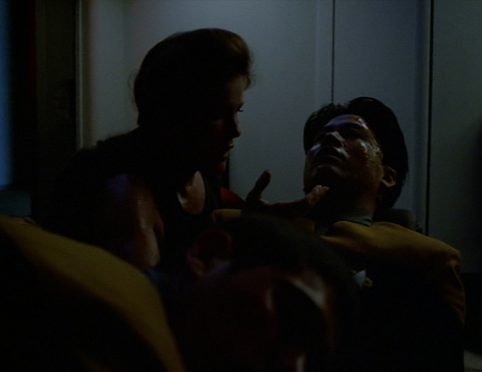 In the mess hall, Janeway finds a large number of the crew all grouped together, including Commander Chakotay and Ensign Harry Kim, unconscious. Janeway notices some sort of growth on the side of Chakotay's neck, from which more of the small organisms exit. Suddenly, Janeway is attacked by a large, multi-tendriled creature. She is able to destroy it, but is now beginning to feel the same symptoms that Neelix felt earlier. Janeway heads for sickbay. When she finally pries the doors open, The Doctor points a phaser at her chin before realizing who it is.