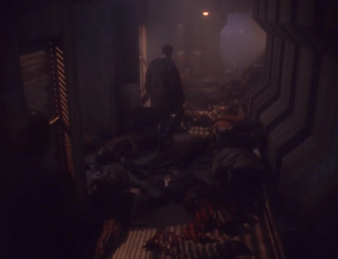 Captain Sisko and Michael Eddington survey the aftermath of a massacre of the Maquis by the Jem'Hadar