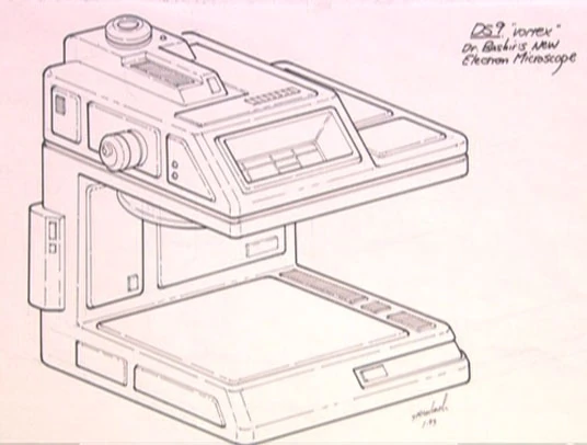Senior Illustrator Rick Sternbach made a sketch for an electronic microscope for use by Doctor Bashir in the Star Trek: Deep Space Nine episode "Vortex". The prop was not built but Sternbach showed the sketch in the DS9 Season 1 DVD special feature "Deep Space Nine Sketchbook".