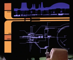 A view on Mordan IV city and its surrounding landscape was visible from Karnas's office, though only barely. The near indiscernible, almost throw-away visual, belied the rather substantial effort, that went into its creation. It was not even a matte painting, the method of choice in the franchise for creating long-view landscape visuals of vistas, but rather a cityscape maquette, combined with a background landscape painting. One of its creators, Mike Okuda had noted in this respect, "Creating models wasn't really our job. We weren't set up for model making in the art department, and we were lucky enough to have the services of Paramount's effects shop, as well as talented outside vendors like [professional model makers] Greg Jein and Tony Meininger. But we tried to help out when the vendors were too busy, or if it was something small that we thought was cool but the budget didn't allow. Mostly we painted a few found objects and a tabletop to create a loose impression of a cityscape. I recall that we used a big wok for the dome of one large building." (Star Trek: The Next Generation 365, p. 43) In regard to the Mordan IV cityscape maquette, he had further remarked, "Rick made most of the model city buildings. He used hot melt glue to create some cool sculptural detail on the skyscrapers. Very simple, but it looked good when photographed. I did paint and tape detail on dome structures what were mostly made from found objects. I recall that one big dome was a cooking wok. Later, I borrowed the shapes of the buildings for the animated city map graphic on the main viewer."[1]