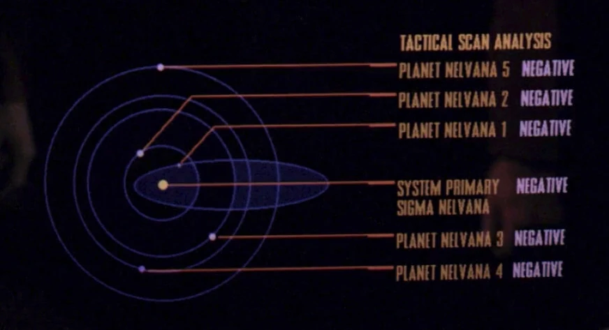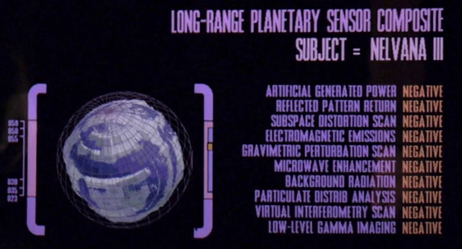 Before entering the Neutral Zone, the Enterprise-D completed a tactical scan analysis of the Nelvana system, which showed the orbit and location of Nelvana III in the system. A long range sensor scan of this planet resulted in negative readings which Data interpreted as no unusual activity. The starship was scanning for artificially generated power, reflected pattern return, subspace distortion, electromagnetic emissions, gravimetric perturbation, microwave enhancement, background radiation, particulate distribution, virtual interferometry, and low-level gamma imaging.