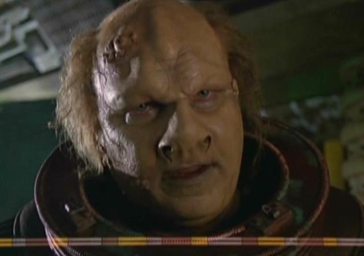 The alien ships continue to hammer Voyager until the shields fail. They restart their dampening field and, once again, the ship begins losing power. But then the field abruptly disappears and full power returns. In engineering, Chakotay reads on the temporary command console that the aliens on board are beaming off. On the bridge, Ensign Kim detects another vessel approaching. It closes in, firing a large volley of spatial charges, which send the three attacking ships fleeing. The new arrival hails them. Tuvok orders Kim to put it on screen. The image of the new ship is replaced by that of a pasty-looking, balding, humanoid, alien man in a dark, smoky room, presumably the ship's bridge. He is clad in a bulky protective suit. Tuvok tries to introduce himself, but the alien interrupts, expecting compensation for the spatial charges he used to drive off the attackers. Tuvok, bemused, agrees. Satisfied, the alien amicably asks them why they are there, in the middle of nowhere. Tuvok and Kim regard him, silently.
