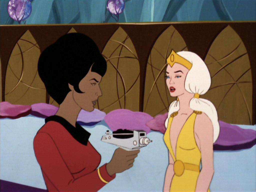 In 2269, on stardate 4187.3, Uhura was on the Enterprise shuttlecraft Copernicus, traveling with Spock and Sulu, when the Slaver stasis box they had on-board indicated the existence of another stasis box on an uncharted icy planet in the Beta Lyrae system. Uhura, Spock and Sulu discovered, in the second box, a weapon of great power. When the Kzinti traveling on the Traitor's Claw found out that the three Enterprise crew members were on the planet with such a newly discovered Slaver stasis box, they twice kidnapped Uhura and the Chuft-Captain held her hostage. Spock and Sulu were able to free Uhura by discovering new settings on the weapon, settings that tricked the Kzinti. (TAS: "The Slaver Weapon")