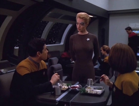 Seven of Nine stands apprehensively in the USS Voyager's mess hall, watching other crewmembers as they sit, eat and interact. She approaches a table, at which Lieutenant jg B'Elanna Torres and Ensign Harry Kim are sitting. She begins to engage them in conversation but all she does is confuse Kim and antagonize Torres. Her manner is brusque, her questions demanding personal information instead of asking, and she does not wait for the answers.