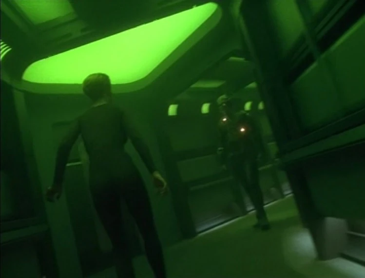 She heads for the bridge, but she sees corridors lit Borg-green, and a Borg drone following her, coldly berating her for leaving the Collective. It tells her that her decision to leave the Collective was foolish because now she is alone, only one, Human, weak, pathetic – part of an imperfect Human race; that she will and cannot survive without the Collective. She says that she will adapt as an individual but the Borg keeps repeating that she is only one, alone, pathetic, one among many, weak for a Borg cannot be one, she will die as one, detached, isolated. She insists that she is an individual and finally escapes the Borg who keeps repeating to her that she will die alone. In a turbolift, Lo-Tarik appears and urges her to go back to the Collective, stating that the Borg drone just now was right about her. She sees the doors open to the inside of a Borg vessel. She hears the echoing, multi-track resonant voice of the Collective, telling her that resistance is futile. She resolutely ignores it all and continues to the bridge.