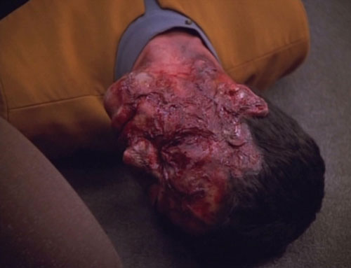 Seconds later, as Voyager moves away from the nebula, the agony suddenly stops. Seven arrives and administers aid with the regenerators. It is too late for one officer though as his face was burned beyond recognition.