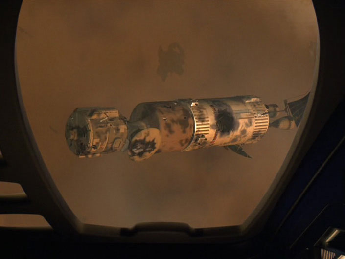 While Paris monitors the search, Chakotay examines the debris in the cargo bay with Seven's assistance. Chakotay is excited by fossilised microbes he discovers in a piece of ore, which could possibly indicate the existence of metallic lifeforms, but Seven is as dismissive as she has been about the rest of the mission. For his part, Chakotay is fascinated by the wide variety of materials the ellipse has gathered over the course of millennia. He wistfully comments he could spend a lifetime studying the contents and says that a love of palaeontology was the cause of his joining Starfleet. Although his responsibilities as both a Maquis and a Starfleet officer stopped him from pursuing it, it's a dream that he has kept with him. With some prodding, Seven admits to wanting to be a ballerina as a child. Chakotay half-jokingly says that perhaps it isn’t too late. Paris then calls them to the cockpit; the Ares IV has been located. To the amazement of all, including Seven, its hull is almost intact. As it is far too large be stored in the cargo bay. Chakotay decides that they will use a tractor beam to tow it.
