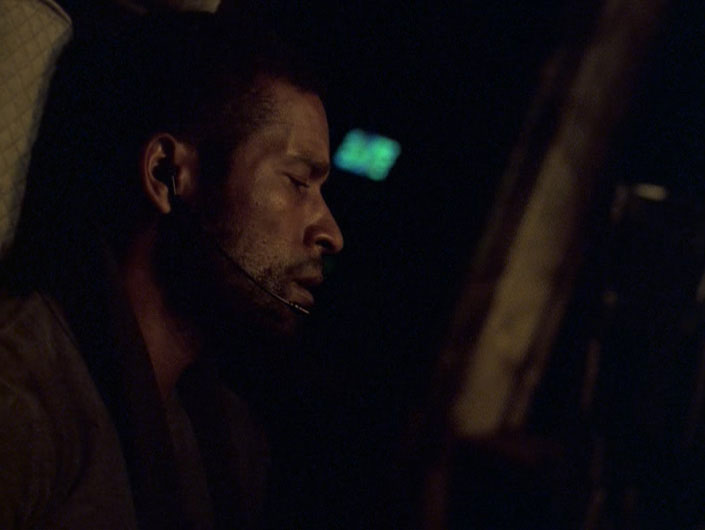 Chakotay awakens as Paris and Seven work on repairs. "It feels like I just went ten rounds with an Andorian…", Chakotay says. He tries to sit up but his injuries make the effort agonizing. Paris, effectively the team's medical officer, orders Chakotay to lie down and stay still. Chakotay asks about the Ares IV, and Paris informs him that it is close by. But any notion of salvage is out of the question, as they have no working engines or deflector shields, let alone tractor beam capability, and hull integrity is close to being compromised. Chakotay, uncomfortable with lying invalid and unable to help, insists on trying to rise. Paris orders him to lie still, and leaves to go and reinforce hull integrity.