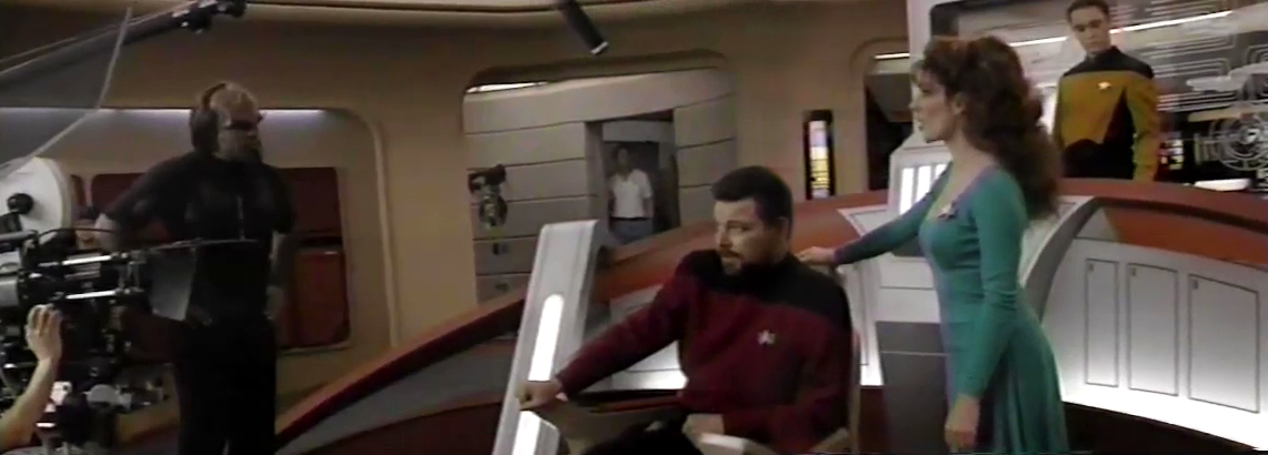 On the bridge, the tactical officer – Lieutenant Wesley Crusher – reports a minor anomaly off the port bow in space. The bridge is even more modified now, with a transparent crosscut of the Enterprise separating the tactical and aft stations. The conn officer is a Cardassian ensign. Riker orders full stop and analysis, Data diagnoses the anomaly as a quantum fissure in the space-time continuum.
