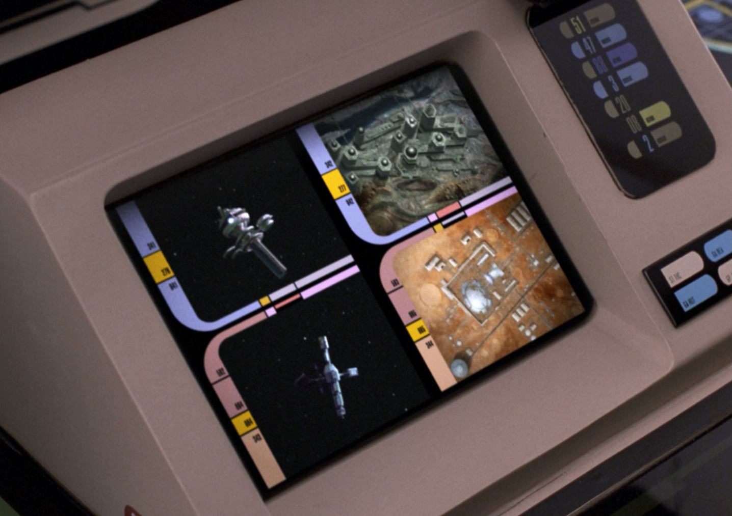 Down in engineering, Worf, Data, La Forge, and Picard study the Array's imaging logs at the master systems display table. Data tells that the Array had been re-programmed to observe several Federation sites. From a monitor in the table, La Forge points out two space stations, Deep Space 5 and Starbase 47, and two planetary bases, Iadara colony and Utopia Planitia Fleet Yards on Mars. Picard notes that they are responsible for new starship development. Worf suggests that the array is being used to engage in covert surveillance of the Federation. Data tells that the Array was accessed six days ago. He shows a video of a Cardassian Galor-class cruiser approaching the station. La Forge says that the telescope is only three light years away from Cardassian space. Picard orders Worf to scan for Cardassians. La Forge offers a PADD to Worf and suddenly he feels dizzy again. When he regains his bearing, La Forge and Data have switched positions and Picard is gone. La Forge thinks that Worf should go to sickbay. He agrees.