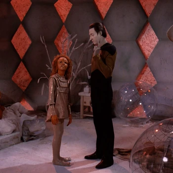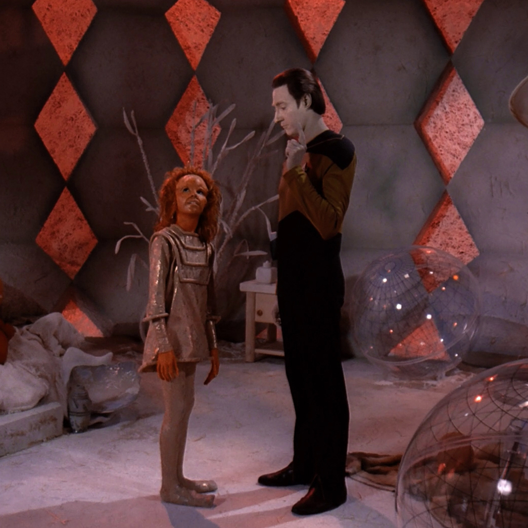 - The teleplay was then assigned to Melinda Snodgrass. During story meetings, the writers considered various characters who could interact with the child. Snodgrass was successful in convincing the other staffers that Data was the best fit for the tale. She later explained, "[Y]ou can picture Data becoming entranced in answering [the] question, 'Is there anyone out there?' First, he's an android and if you ask him a question, you're going to get an answer. Secondly, the whole thing would be so charmingly intriguing to him, that he would do it [...] You never could picture any of the other characters doing that, but Data can make the mistake, and I don't mean that in a pejorative sense, and step out of his careful Starfleet training because he's really just growing up. He's more of a child than Wesley." (Captains' Logs: The Unauthorized Complete Trek Voyages, p. 179)