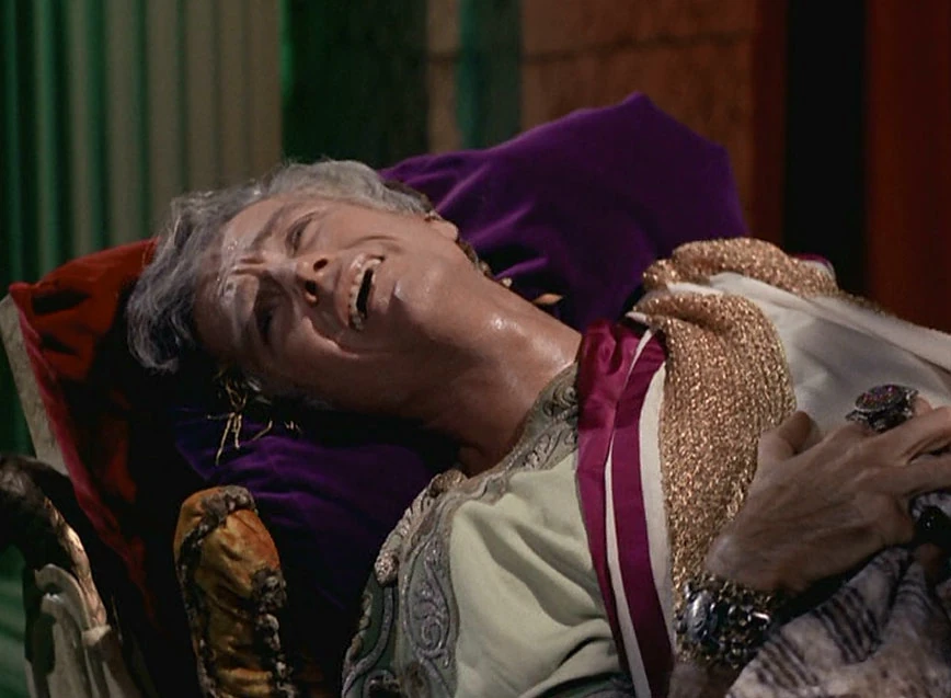A simple cut in the leg had developed an unknown infection which caused Parmen to have a fever and lose control of his powers. Furniture is thrown around and the Enterprise is shaken in orbit, while Kirk, Spock, McCoy, and Alexander duck and hide from the flying objects. "Fascinating. I believe we are experiencing the psychokinetic manifestations of Parmen's delirium", Spock notes. Philana, Parmen's wife, is able to distract Parmen long enough for McCoy to sedate him with a hypospray, ending the chaos. Later, Dr. McCoy's treatment of Parmen is effective and the landing party prepares to leave the planet. However, the Enterprise is frozen; Scott reports that there are no functional transporters, navigation or even subspace communication with Starfleet. Captain Kirk barges into Parmen's chamber, and Parmen strips Kirk of his phaser and tells him that guests must recognize his supremacy. In an allusion to the Greek ideal of guest-friend, Kirk retorts: "Guest? You don't know the meaning of the word. Guests are not treated like common prisoners." Parmen uses his psychokinetic powers to force Kirk to slap himself in the face repeatedly.