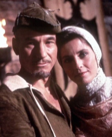 At the castle, Q is surprised and frustrated at Vash and Sir Guy being so agreeable to each other. When Sir Guy dismisses her back to her chamber, Picard is standing in the shadows, disguised as a hooded worker in the castle. Back in her room, Picard climbs in through Vash's window and briefly explains the situation. However, Vash is reluctant to escape with him when she hears he has come alone. She says she will stay and marry Sir Guy if it comes to it, but Picard picks her up to carry her. When guards burst in, she pulls his sword on him, causing his capture. Q looks on in amusement.