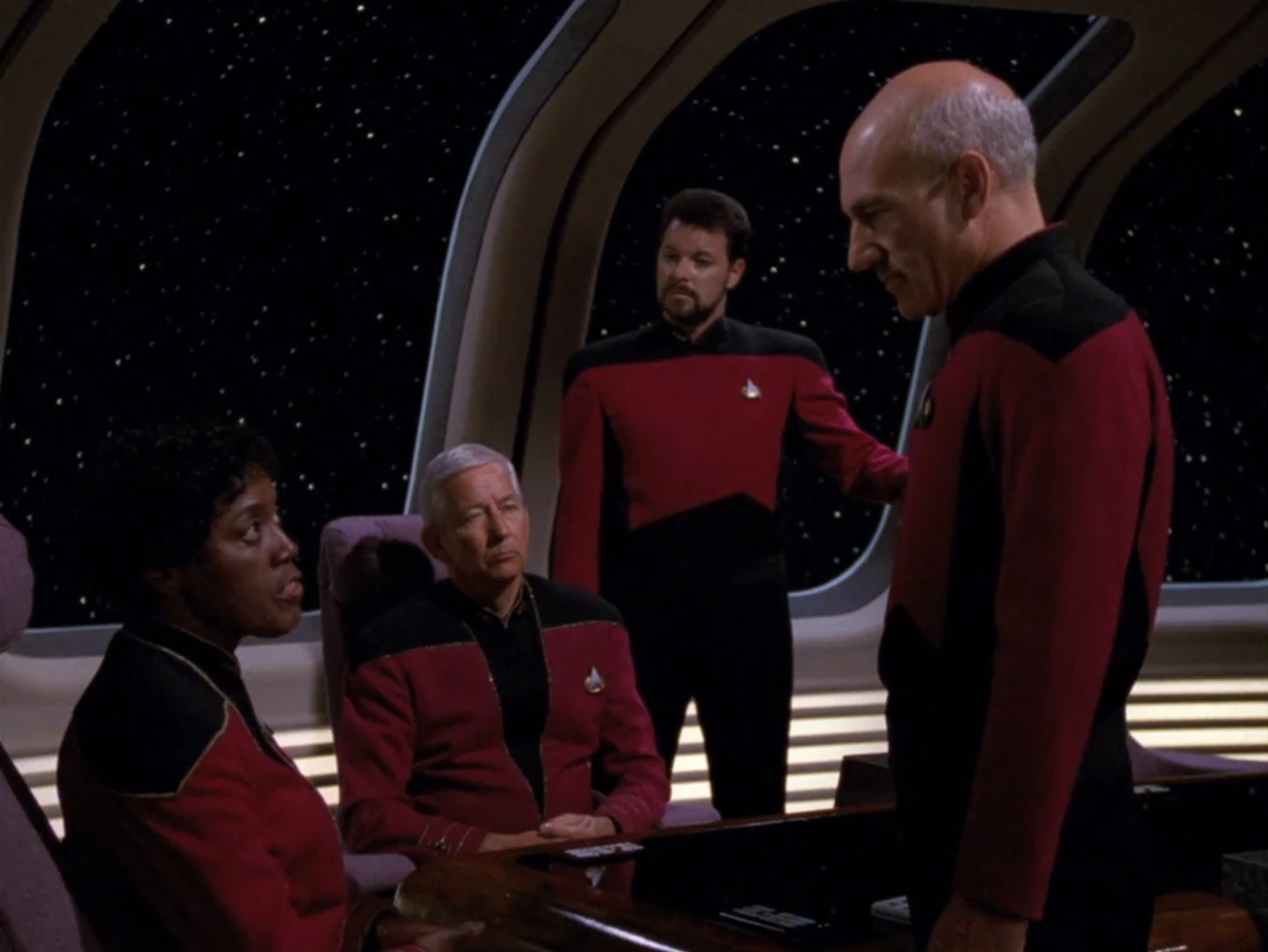 Meanwhile, Captain Picard meets with several senior Starfleet flag officers, including Fleet Admiral Shanthi, to discuss the Klingon civil war at Starbase 234. In the Enterprise-D's observation lounge, Picard briefs the admirals on three engagements occurring in the past two weeks that were won by ships loyal to the Duras family. Shanthi reminds Picard that none of those facts are the Federation's concern because the Klingon civil war is by definition an internal matter of the Empire. Picard says that would be true if the civil war were entirely internal, but if the Duras family is being aided by the Romulan Empire, then it very much becomes a concern for the Federation. Picard points out that the Romulans have been trying to destroy the Klingon-Federation Alliance for the last 20 years and the Duras family has been secretly conspiring with them at the same time. Picard asks her if it seems strange that the Duras are able to overpower and outmatch Gowron's forces at almost every turn. Shanthi speculates that the Duras family may have better leadership, but Picard states it's also possible that they're getting help. Picard reminds the admiralty that the Romulans are willing to take huge risks to gain any advantage they can over the Federation and now, with the future of the Klingon Empire in the balance, can the Federation seriously believe that the Romulans are content to just stand by and watch it unfold?