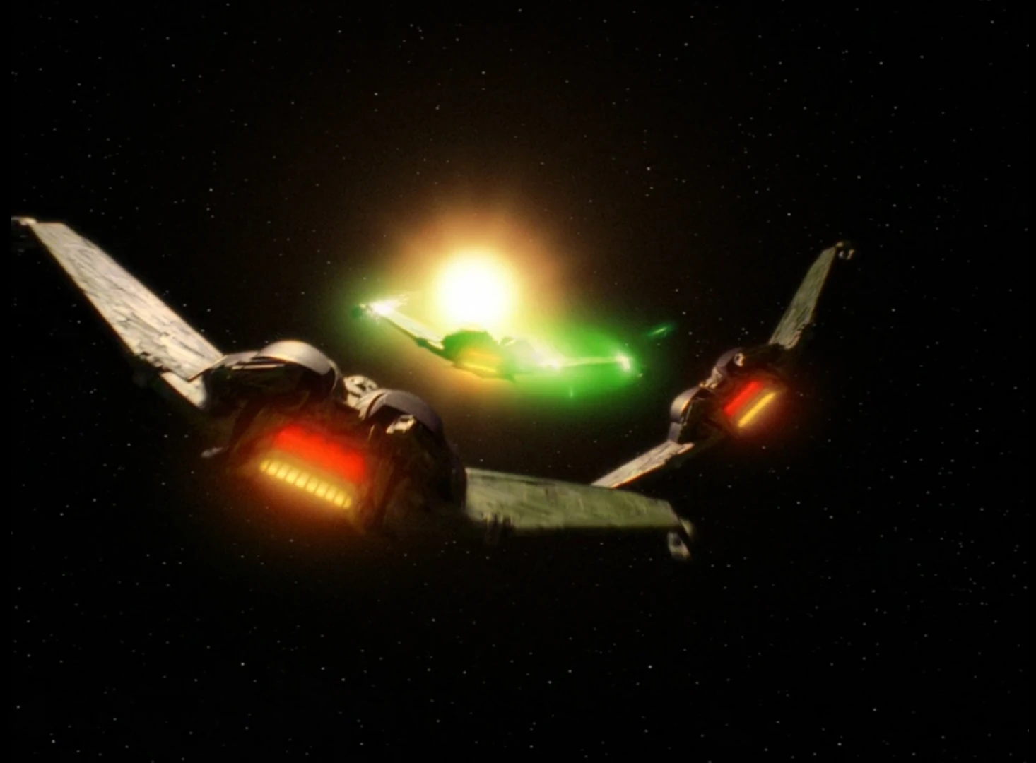 Kurn's ship, the Hegh'ta, with Worf now aboard as tactical officer, is narrowly escaping destruction by two other Birds-of-Prey near a sun. Most of the bridge crew lie dead, and the Hegh'ta is losing shield strength fast. With no weapons left to fight, Kurn instead uses a clever technique of engaging warp drive near a star's surface, causing a large solar flare which destroys the two pursuers.