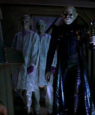 Although this style of uniform was phased out of common use as early as 2371, some Romulan officials (including General Velal) continued wearing it as late as 2375. (TNG: "Contagion", "The Enemy", "Face Of The Enemy"; DS9: "Visionary", "The Dogs of War")
