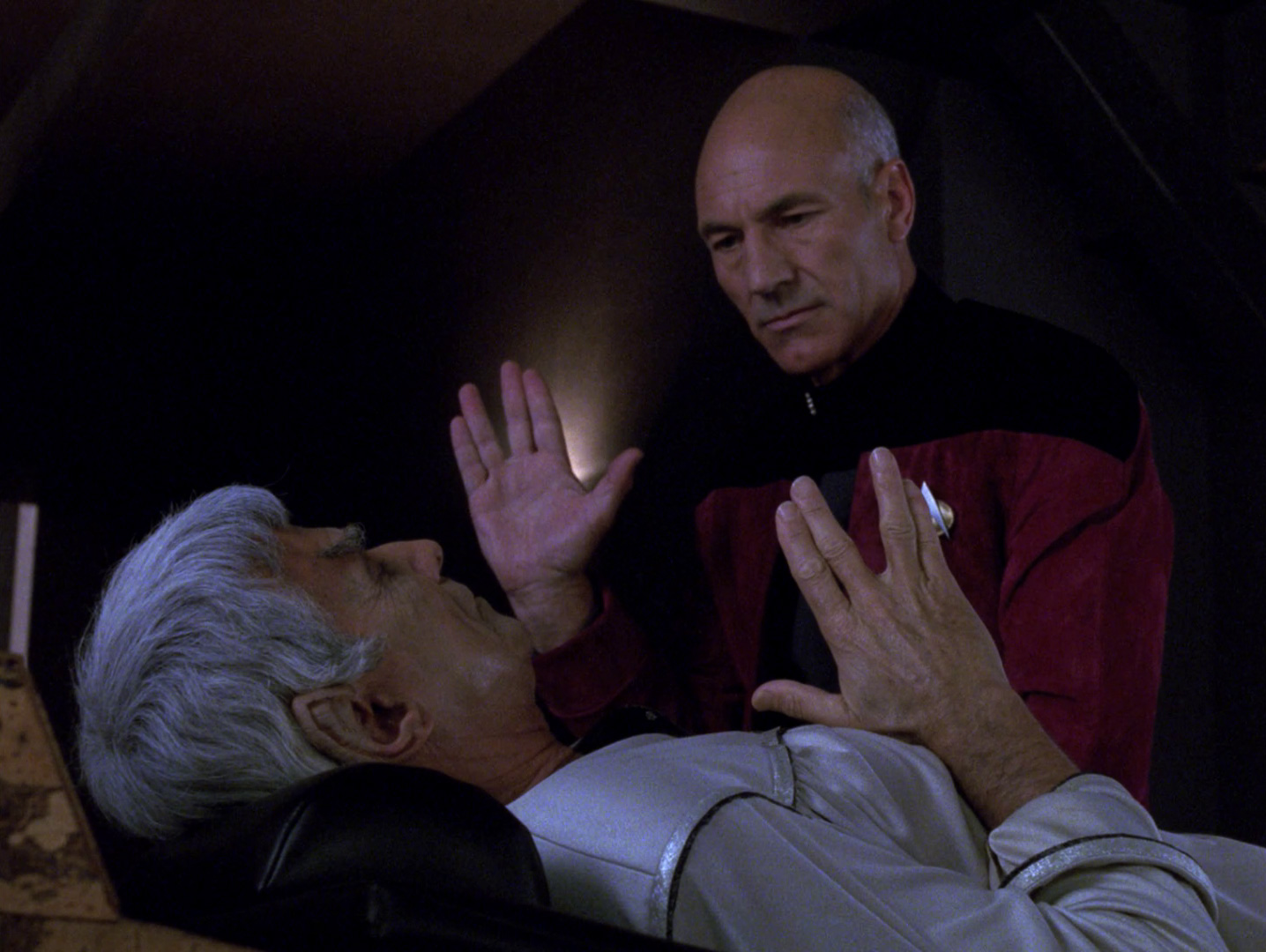 [Sarek struggles to perform the Vulcan salute. Picard assists him, then returns the hand gesture]