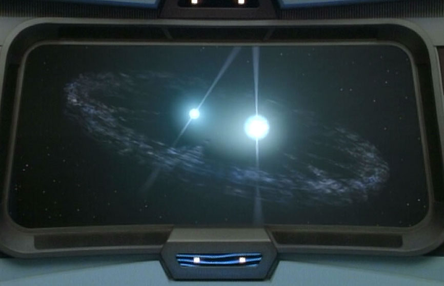 She arrives and sees on the viewscreen what Chakotay called her to see: two binary pulsars. Chakotay informs her of the extent of the combined gravitational pull: anything within fifty million kilometers is getting pulled in and destroyed. He informs her that Voyager is well out of range. Chakotay comments that they can still collect some invaluable data if they are careful but notices that she is not paying attention and the strain on her face from her headache is evident. She apologizes, puts the project in his hands and leaves the bridge.