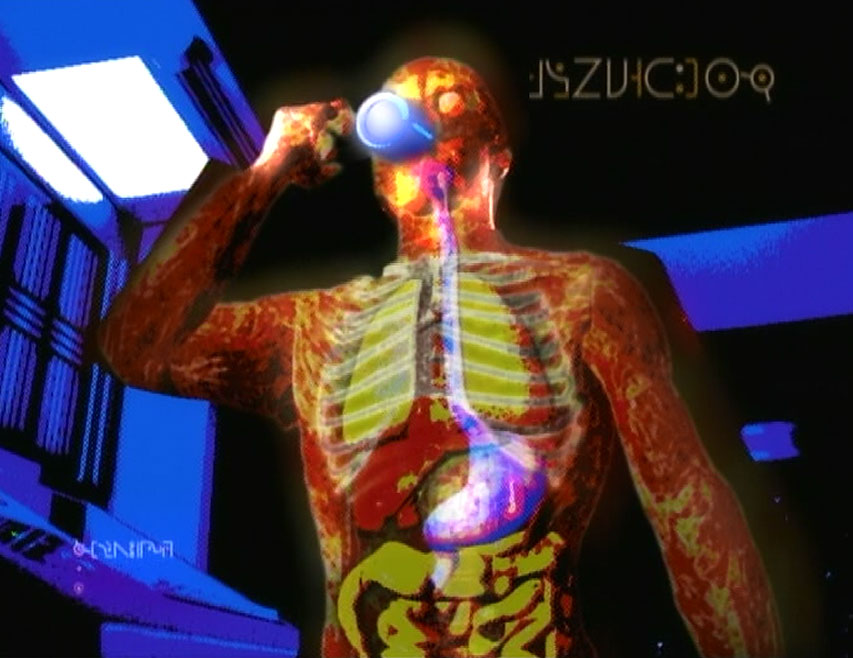Returning to the Da Vinci simulation, Seven informs The Doctor that she counted 56 aliens and surmises that they are performing experiments on the crew. They decide that the next course of action they are going to take is to stop the aliens and their experiments. The Doctor says that they must act quickly, before these induced genetic mutations, growing ever more serious, start becoming fatal. Seven suggests that a phaser beam should make the aliens visible, however The Doctor points out that this may cause the aliens to retaliate by inflicting severe mutations on the crew, before recalling his earlier hypothesis that the genetic tags are the key and suggests causing a ship-wide neuroleptic shock to disable them. Although the shock will be, as The Doctor puts it, "rather… painful" the crew will recover. Seven suggests modifying the ship's EPS relays to deliver the shock. The Doctor agrees with her plan.