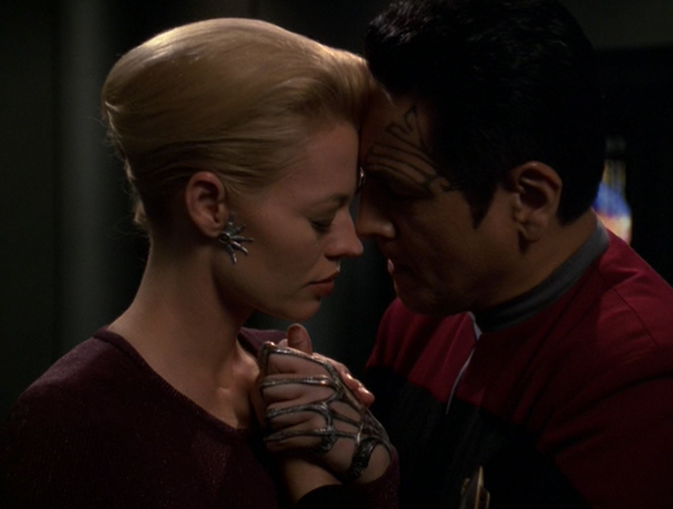 Again during the same year, Seven and an injured Tuvok were captured by Penk, a Norcadian who organized the spectator sport Tsunkatse, and Seven was forced to fight in the ring. After rescue, Tuvok thanked her for taking his place in a red match and asked if she had recovered. Seven said that her victory only came from her loss of control, and worried that the three years she had spent regaining her Humanity were lost in the ring. However, Tuvok pointed out that her feelings of guilt, shame and remorse meant that her Humanity had been reaffirmed, not lost. (VOY: "Tsunkatse")
