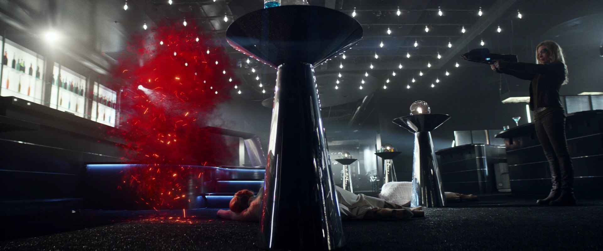 However, far from the impression she had given Picard, Seven still intended to kill Bjayzl. She transported into Bjayzl’s nightclub and confronted the criminal businesswoman after clearing out the lounge by shooting her bodyguards, causing all others present to flee, leaving Bjayzl alone. Bjayzl tried to stall until her security arrived, but Seven knew what she was trying to do, and sardonically told her so. Bjayzl then began trying to talk Seven out of killing her, but Seven coldly cut her off with raised rifles and a bitter retort that Icheb had been a son to her. She then vaporized Bjayzl with shots from both rifles. Seconds later, Bjayzl’s security team arrived, and Seven furiously carved a path through them with the rifles. (PIC: "Stardust City Rag")