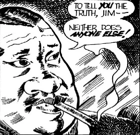 This is the first – and last – story arc drawn by Bob Myers. Myers had a very different style than anyone who came before or after him, and his unique approach created some very unusual images. For example, Starfleet officers smoking cigarettes, Scotty as a helmsman, Spock with ears tilted 45 degrees outward from his head and with every appearance of being asleep most of the story. There were courier clones whose initial uniform appears to be designed to look like a swimsuit with a neckline that plunges to the navel, engineering crewmen wearing sunglasses in the engine room, a captain's log written in a spiral notebook in longhand, phasers that resemble .45 automatics, and many others. The resemblance from a story standpoint to TOS: "Wolf in the Fold" is fairly obvious, but it is unknown whether it was done intentionally. Also unknown is the means by which the two clones and the original diplomat combine to decode and deliver their message, or why they were even necessary. By every measure of story and art, this is the one arc that is so extraordinarily different from every other as to almost be unrecognizable as Star Trek.