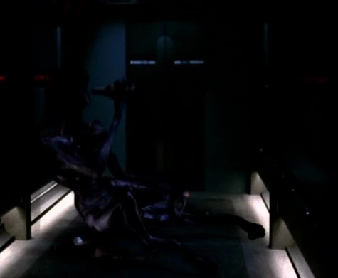 A difficulty similar to portraying the aliens walking through a corridor was how to fit such a tall alien into the corridors, in the first place. Ron Thornton commented, "That it would be something nasty which was supposed to be nine feet tall made it very difficult to do. It was a little tight, squeezing a nine-foot tall character into the corridors, but I think it worked out." (The Official Star Trek: Voyager Magazine issue 16, p. 37)