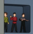 In the third issue of the Doctor Who crossover comic Assimilation², Kirk, Spock, McCoy, and Scott investigate a Federation archaeological team on the planet Aprilia III on stardate 3368.5, which had lost contact with Starfleet. Upon landing in the shuttlecraft Galileo, they are greeted by project manager Jefferson Whitmore, who assures them that all is well and gives them a tour of the facility, but Kirk finds the staff suspiciously calm, which Spock agrees with as by Human standards, the research team seemed remarkably placid and unemotional. The team later return to the facility after dark where they meet the Fourth Doctor, assuming he's a member of the research team and he helps them break the electronic lock with his sonic screwdriver and then offers Spock a jelly baby. Together, they infiltrated the facility. There, they find the researchers standing catatonically, with small cybernetic devices in their ears. It is discovered they were under the control of the Doctor's enemies, the Cybermen. A battle ensues and Spock and Scotty use their phasers on two Cybermen, while Kirk and the Doctor handle the Cyber-Controller. The Doctor then uses gold dust to clog up the Controller's respiration, allowing Spock to fire his phaser and destroying it. After the Cybermen are defeated and the Doctor slips quietly away, Spock assures Kirk there are no signs of anymore Cybermen on the planet, but Kirk arranges for a permanent garrison of Starfleet Security personnel to protect the researchers just in case.