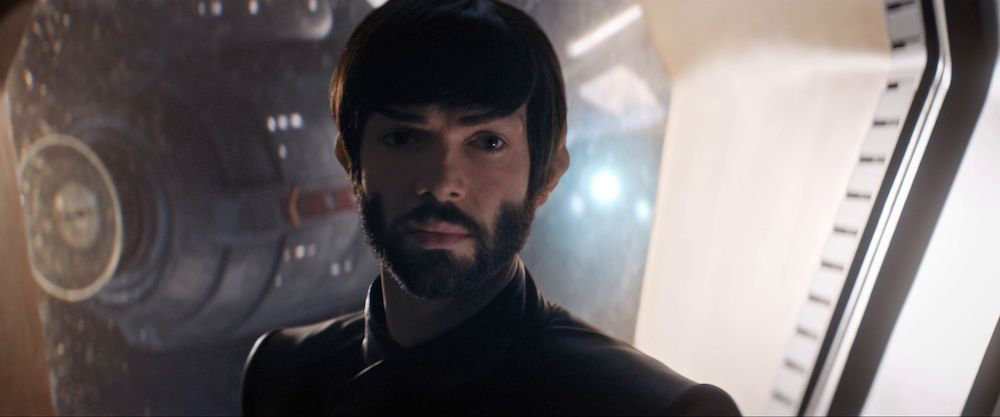 The young Spock from TAS: "Yesteryear" was voiced by Billy Simpson. Carey Scott recorded some dialogue for a younger Spock in Star Trek V: The Final Frontier, but his scenes were cut. Spock is also portrayed by an unknown infant in that film. And while Nimoy portrayed the elder Spock in the film Star Trek, his younger alternate reality adult self was played by Zachary Quinto (who reprised the role in Star Trek Into Darkness and Star Trek Beyond), as well as briefly by Jacob Kogan, who portrayed Spock as a young boy. Nimoy reprised the role of Spock for a cameo in Star Trek Into Darkness. Liam Hughes portrayed a young Spock in the Discovery episode "Brother" while Ethan Peck voiced the adult version of the character in the same episode. Peck also played the character in subsequent episodes of Star Trek: Discovery, Star Trek: Short Treks, and Star Trek: Strange New Worlds.
