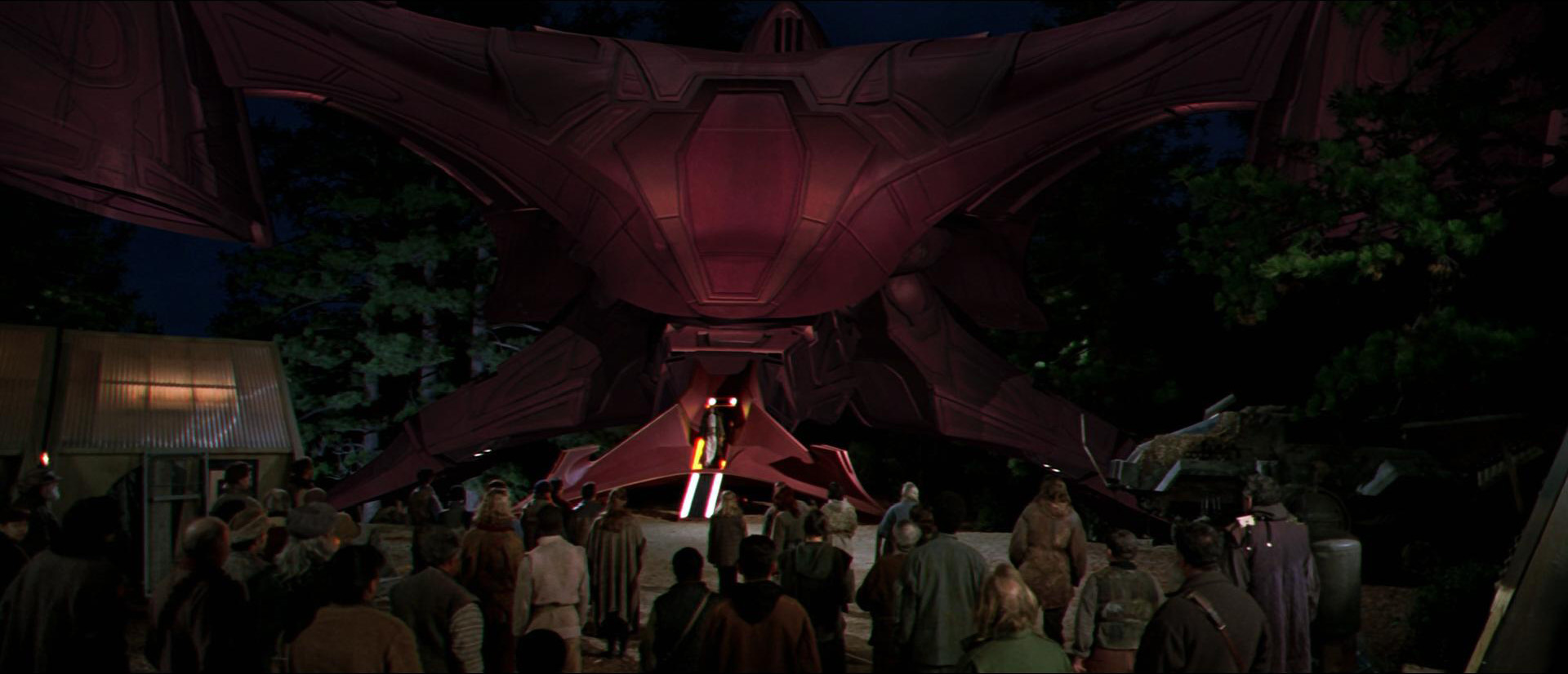 In Montana, a crowd of observers, including Cochrane, Lily, Picard, and the other Human members of the Enterprise's senior staff, watch the historic landing of the first extraterrestrial craft to openly and publicly visit Earth. Cochrane, amazed, marvels to Riker that the aliens really are from another world as Riker reminds him that they're going to want to meet the man who flew that warp ship that drew them there. Cochrane approaches them as the alien leader makes his way forward and removes his hood, revealing a set of pointed ears and extends his hand in greeting: "Live long and prosper." Cochrane attempts to return the gesture, but cannot get his fingers to mimic the alien's. Instead, he offers him the Human equivalent - a handshake. "Thanks." he says. Picard, happily noting that all is proceeding as it should, notes to his crew that the time has come for them to make a discreet exit and let history unfold as it should. With that, Riker taps his combadge and orders the Enterprise to stand by to beam them up as the captain heads for Lily. She notes that the time has come for him to go and remarks how she envies him and the world he's going to. Picard responds how much he envies her that she gets to witness Humanity's first steps into a new frontier before telling her that he'll miss her. With a kiss good-bye, the Enterprise crew departs unnoticed.