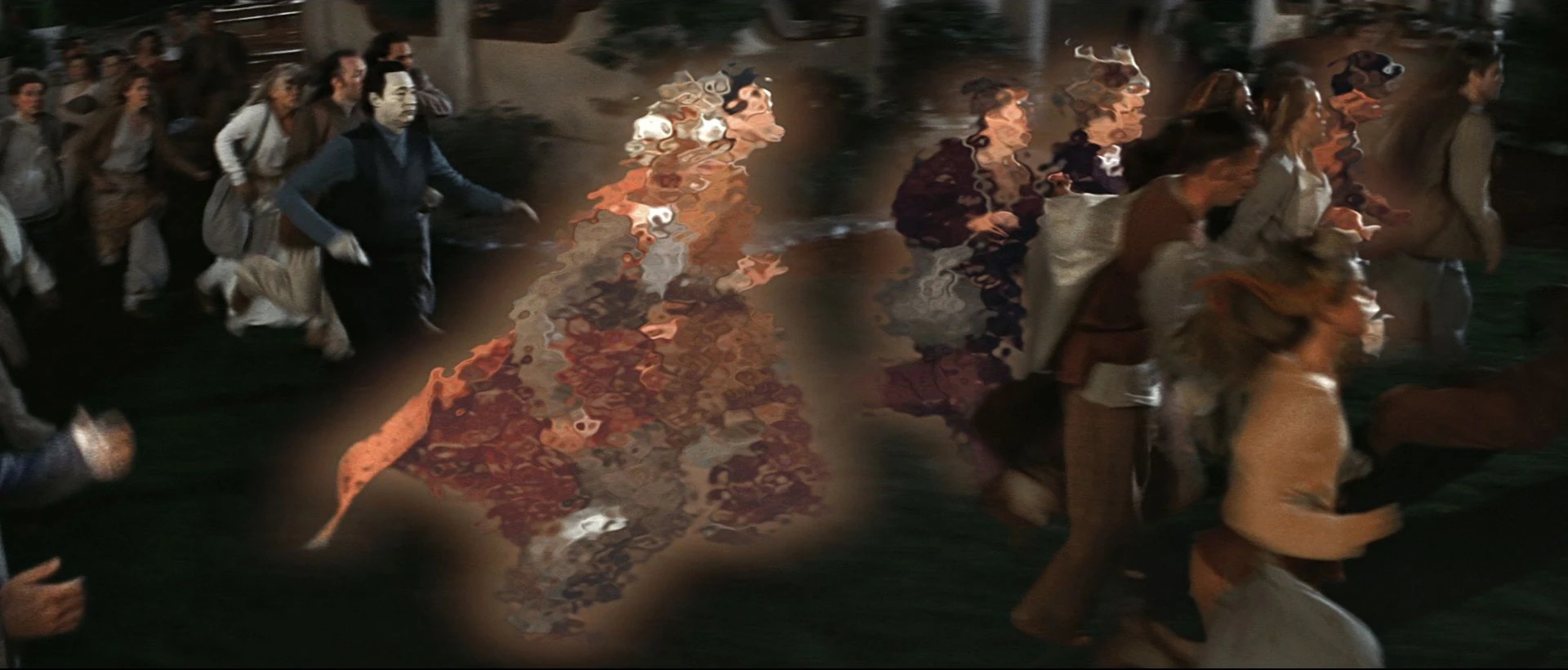 The quiet of the idyllic setting is suddenly disrupted. A bolt of phaser fire appears from out of nowhere, striking a narrow bridge as Ba'ku children scramble across it. Onlookers are shoved to the ground as invisible forces crash through the village.