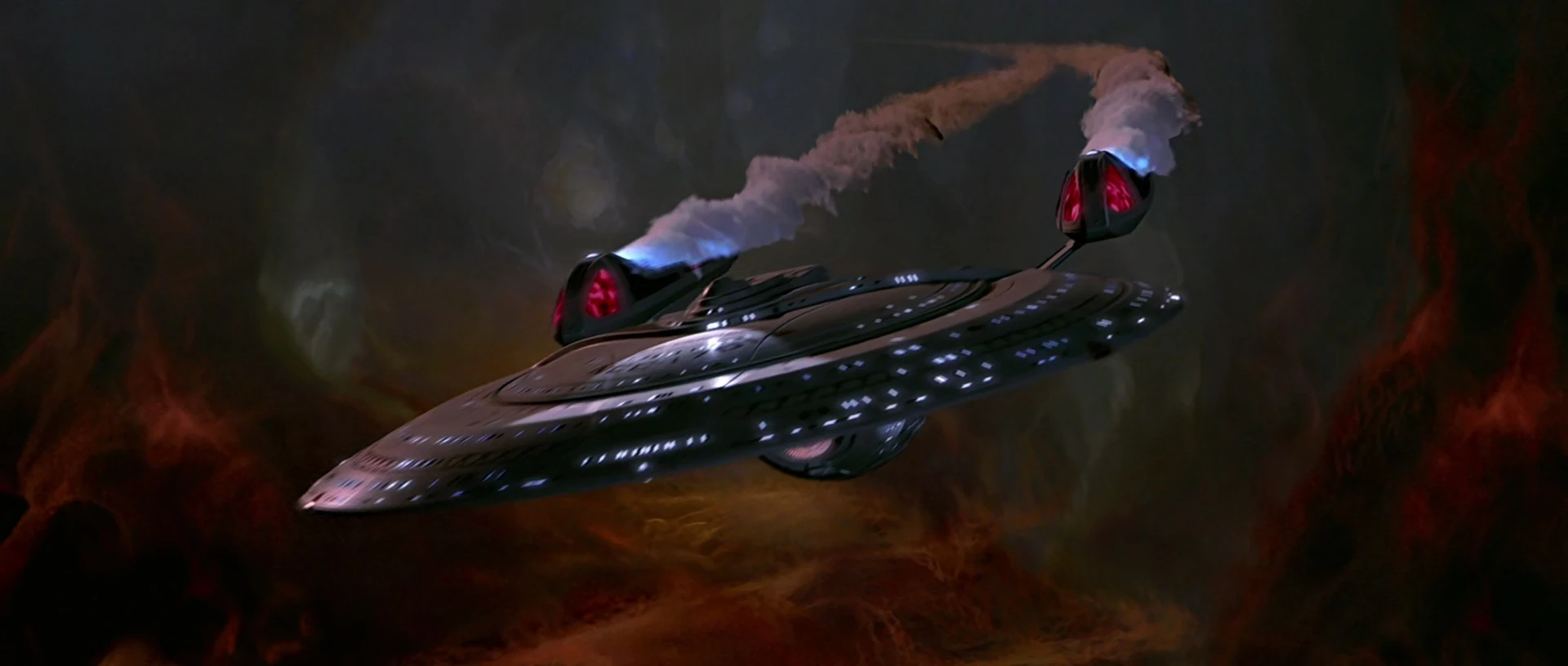 Smoke and plasma leak into the bridge as the Enterprise takes heavy fire. Riker hangs onto his chair as the ship shudders beneath him. In engineering, La Forge and his team are suppressing fires and trying to keep the ship together. "We're gonna blow ourselves up!" La Forge shouts up to the bridge, "We won't need any help from the Son'a!" On the main viewer, a large red cloud looms in the distance. Perim warns Riker that they do not want to go in there, but Riker disagrees. Taking over the helm, Riker sets a course directly for the cloud and takes the Enterprise in.
