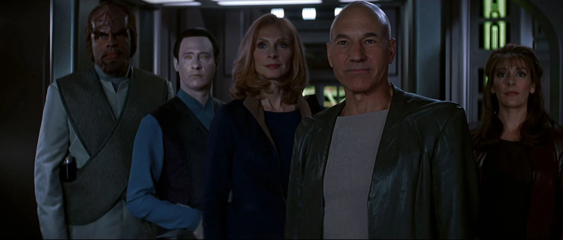 On board the Cousteau, the captain's yacht, Picard is out of uniform, preparing to go to the surface alone. Beaming supplies aboard the yacht, he opens a cargo container and checks the contents: phaser rifles. The large aft hatch suddenly opens, revealing La Forge, Riker, Troi, Worf, Crusher and Data, each ready to help their captain defend the Ba'ku. Found out, Picard orders his command crew to return to their quarters, but, as Riker says, "No uniform, no orders." Each is prepared to risk their career to stand behind Picard, who grudgingly accepts their help. He orders Riker and La Forge to take the Enterprise out of the Briar Patch to contact Starfleet Command and let them know the details of Dougherty's plan. The rest go with him to the surface. Tellingly, it is Data who says, "Saddle up." Then he adds, "Lock and load."