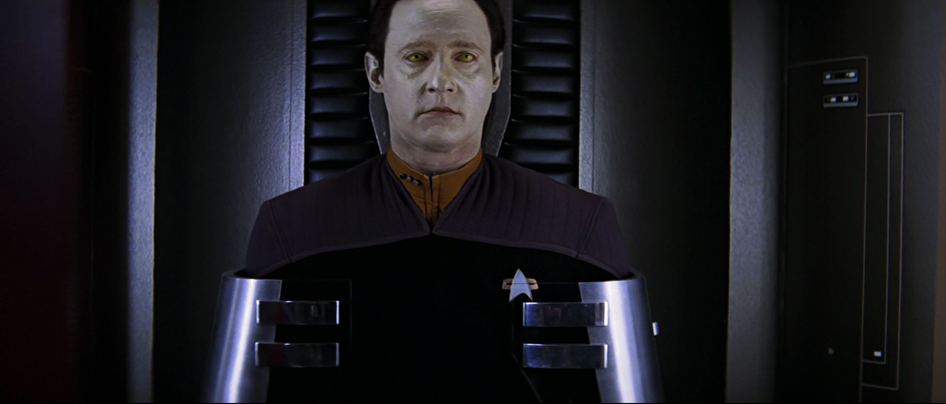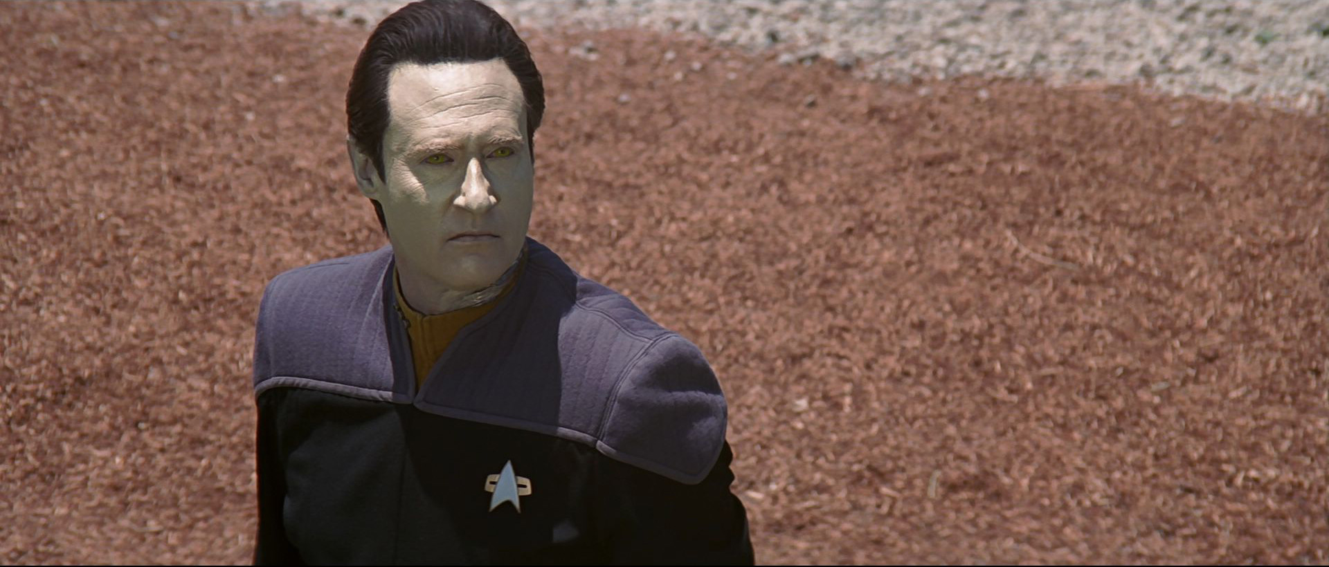 Subduing his enemies, the researcher removes his helmet – it is Lieutenant Commander Data – the left side of his neck having been apparently damaged.