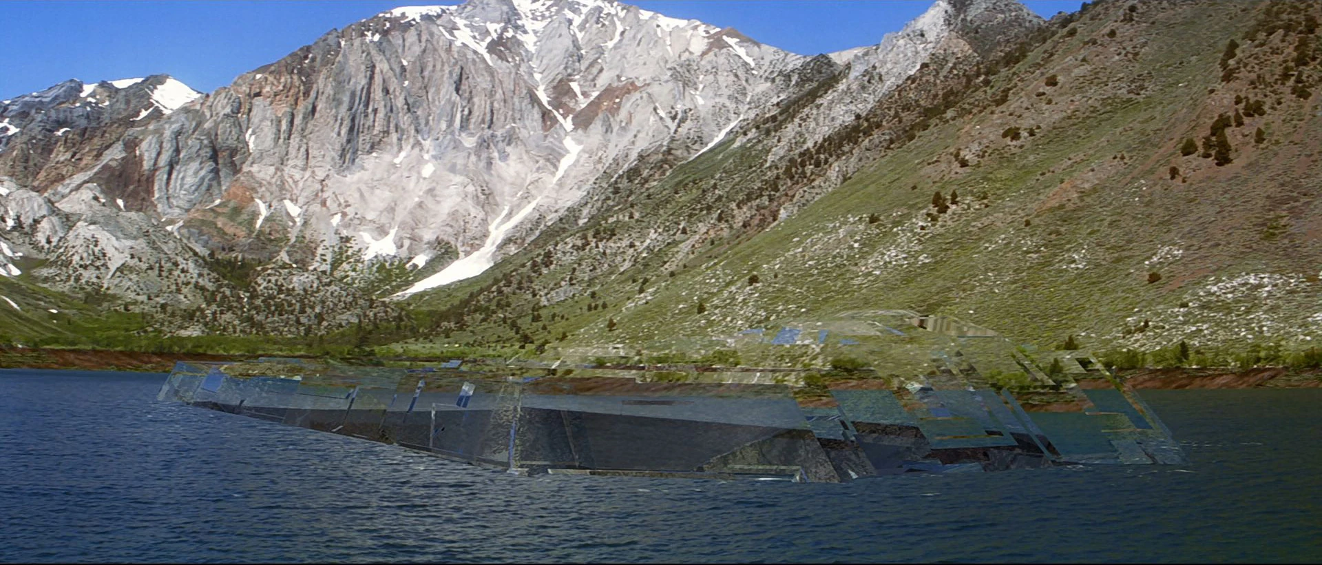Arriving at a lake surrounded by snow-topped mountains, Picard and the group of Ba'ku watch Data as he uses his tricorder to scan for evidence. With heavy deposits of kelbonite in the mountains, Data says, the tricorder's functions are limited. Entering a few more commands into the scanning device, Data detects something "curious", strong neutrino emissions, and then steps into the lake, disappearing below the surface. Descending deeper into the lake, Data continues his scans as fish swim past. Finally getting the readings he was in search of, he trudges across the bottom of the lake to a floodgate. Emerging from the water, the android opens the gate, emptying part of the lake and revealing the glistening hull of an invisible starship. Data tells Picard that the ship is "clearly of Federation origin."